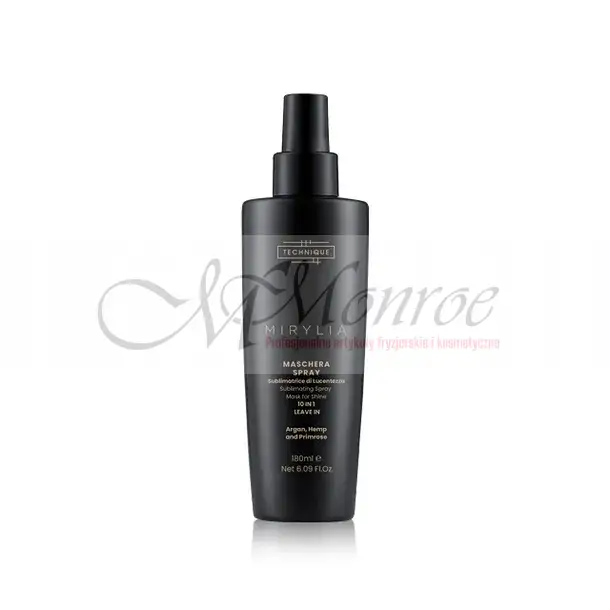 Spray wielofunkcyjny Technique Mirylia Olio przeznaczony jest do włosów matowych. Zawiera ekstrakty: arganowy, konopny i z pierwiosnków. Dzięki temu, ma silne działanie: odżywcze, nawilżające, wzmacniające i ochronne. Spray Technique Mirylia Olio dyscyplinuje pasma, dodaje im miękkości i blasku.