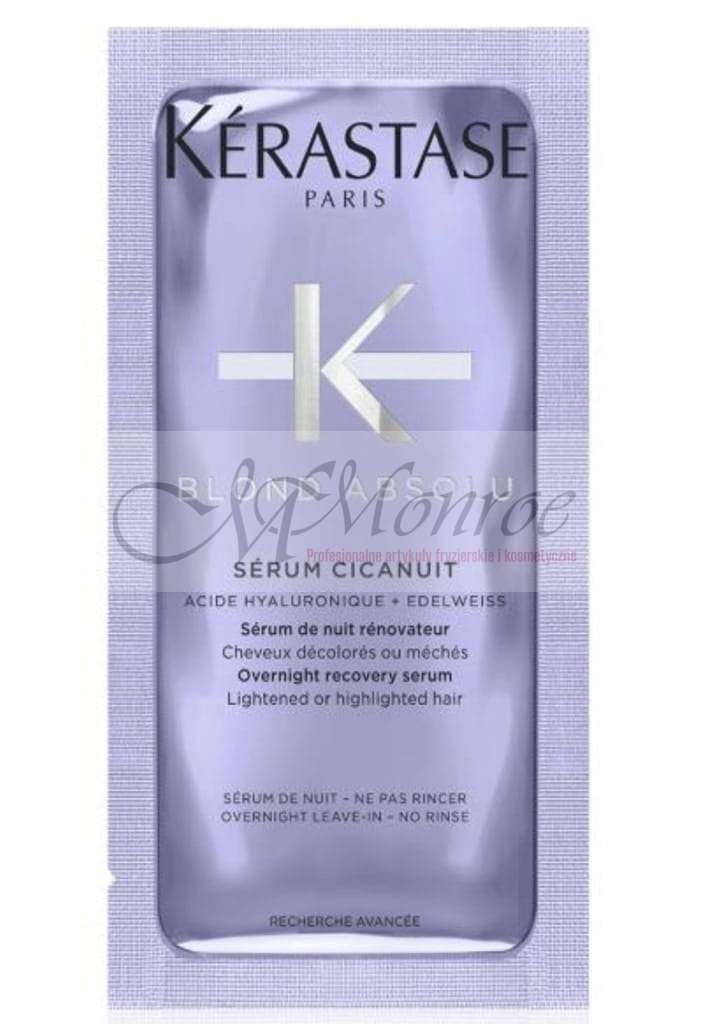 Kerastase Blond Absolu Serum Cicanuit do włosów blond na noc. Zapewnia regenerację pasm podczas snu. To pierwsze serum do włosów z kwasem hialuronowym, zawierające z łatwością wnikające we włókna włosa składniki, które praktycznie całkowicie się wchłaniają przez noc. Stosowane przed snem, nie wymaga mycia czy zwilżania włosów. Efekt? Rano twoje włosy są miękkie i nawilżone. Serum odpowiada doskonale na potrzeby włosów blond i rozjaśnianych, które wskutek zabiegów chemicznych i farbowania stają się delikatniejsze, słabsze, uwrażliwione. Serum zapewnia nie tylko regenerację włosów, ale również chroni je podczas snu przed zniszczeniami wskutek pocierania o poduszkę i działania innych czynników zewnętrznych.