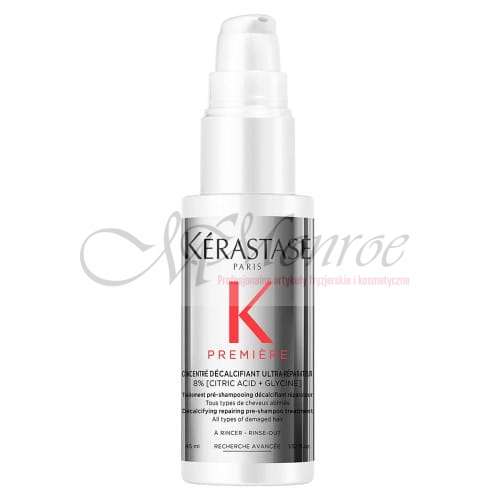 Kérastase Première Concentré Décalcifiant Ultra-Réparateur pierwsza kuracja przed użyciem szamponu, która usuwa calcium i całkowicie regeneruje każdego typu włosy zniszczone. Twarda woda zawierająca jony wapnia może powodować uszkodzenie już i tak delikatnych włosów nadmiernie obciążanych zabiegami lub włosów rozjaśnianych. Zniszczone włosy są bardziej porowate, więc wchłaniają trzykrotnie więcej wapnia niż włosy naturalne. Skoncentrowana dawka czystych kwasów ma podwójne działanie: usuwa nadmiar calcium z włosów i regeneruje je od wewnątrz i na zewnątrz, przywracając włosom siłę, nadając im miękkość i połysk.